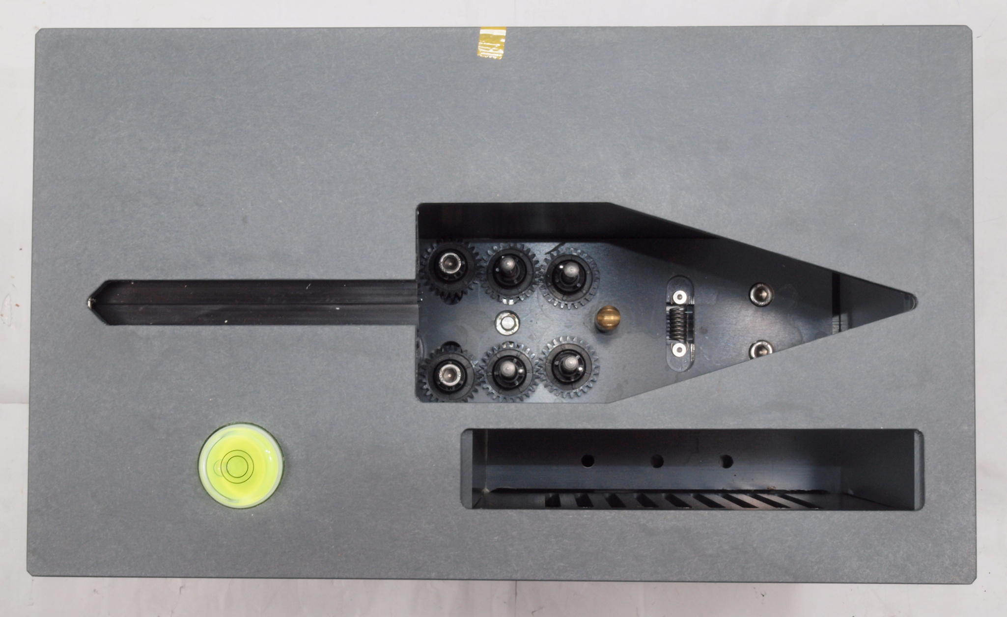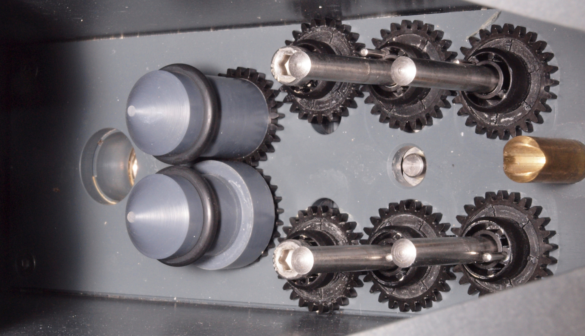 | A42. 点検中 レコード駆動部を見る。左側がレコード回転ローラー、右2段4個洗浄ブラシ駆動。 | ||||||||||||||||||