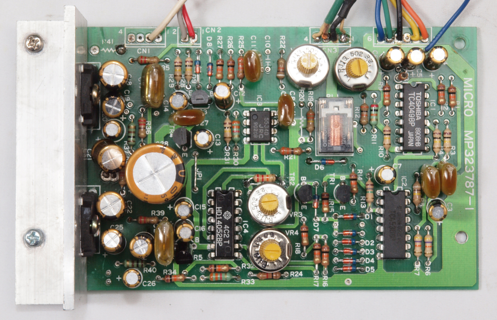 | C12 .修理後 電源部整流基板。 電解コンデンサー3個、リレー2個、整流ブリッジダイオード1個、TR(トランジスター)1個交換。フイルムコンデンサー2個、整流ブリッジダイオードに放熱器追加。 | ||||||||||||||||||||||||||||||||||||||||||||||