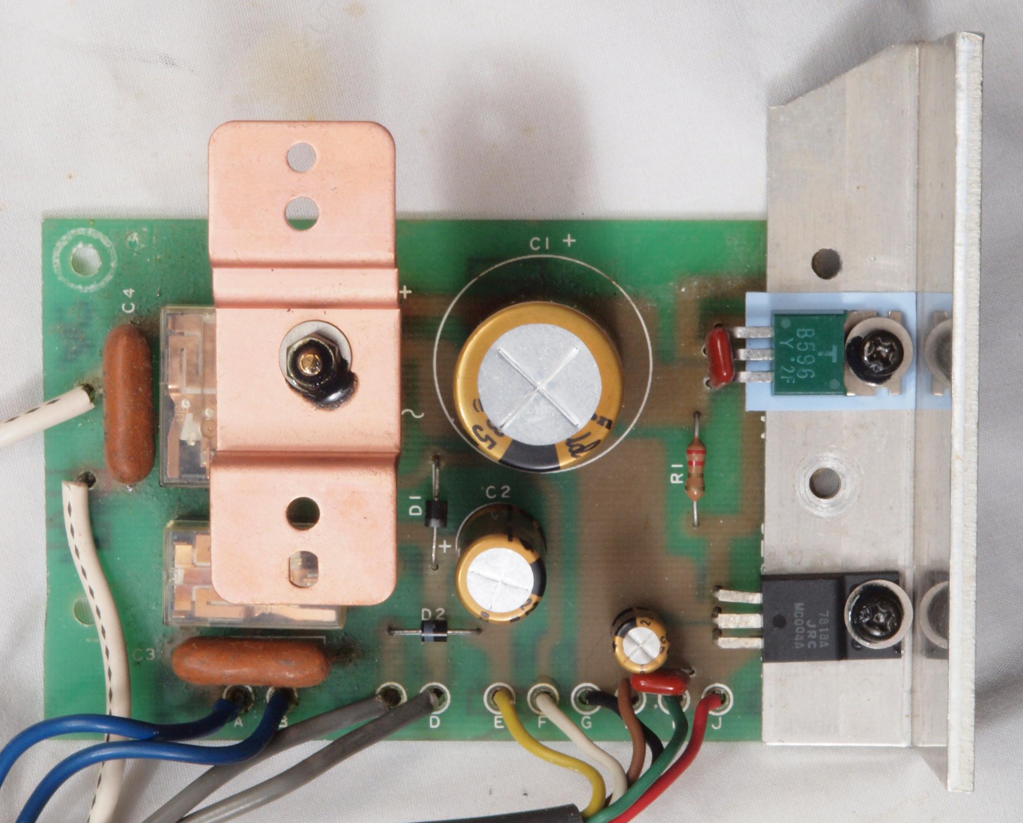 | C12 .修理後 電源部整流基板。 電解コンデンサー3個、リレー2個、整流ブリッジダイオード1個、TR(トランジスター)1個交換。フイルムコンデンサー2個、整流ブリッジダイオードに放熱器追加。 | ||||||||||||||||||||||||||||||||||||||||||||||