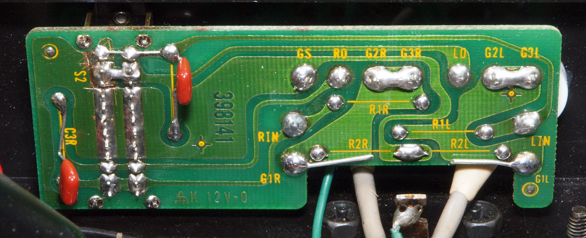 | C75. 修理(半田補正)後 入力RCA端子基板裏 半田を全部やり直す。 フイルムコンデンサー2個増設。 |