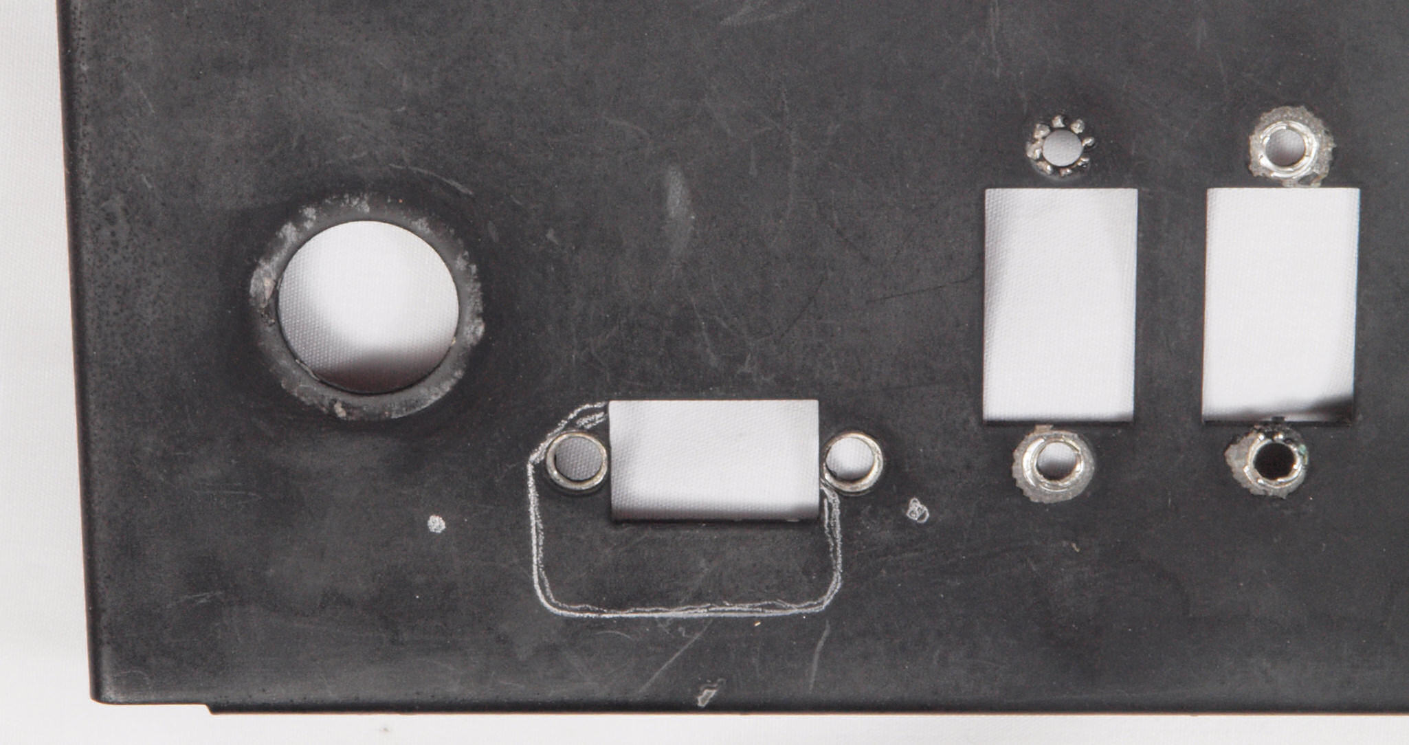 CC2. 修理中 3Pインレットの取り付け穴加工。