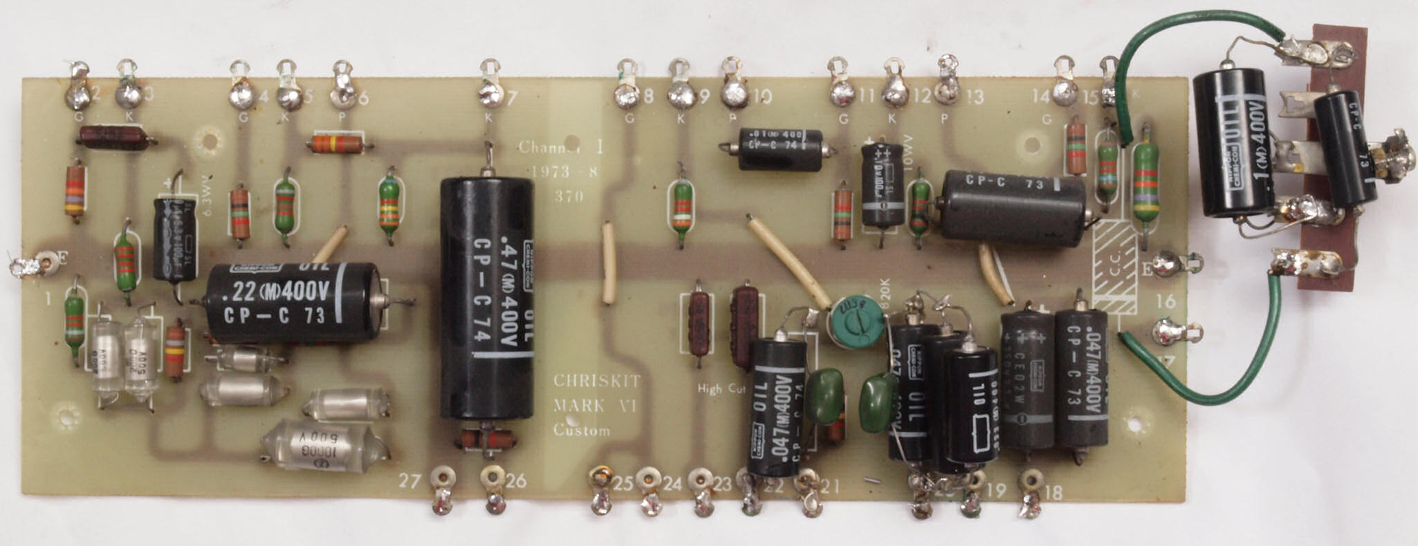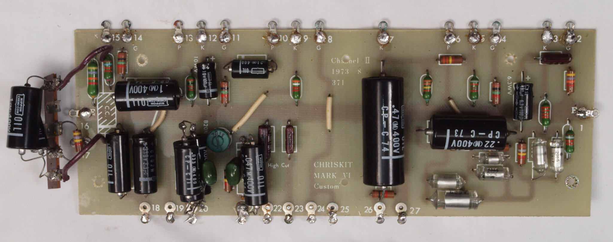 C22. 修理後 L側信号基板。 半固定VR1個、電解コンデンサー2個、フイルムコンデンサー10個交換。
