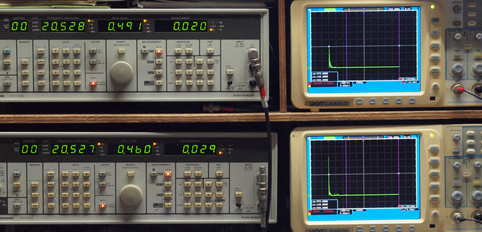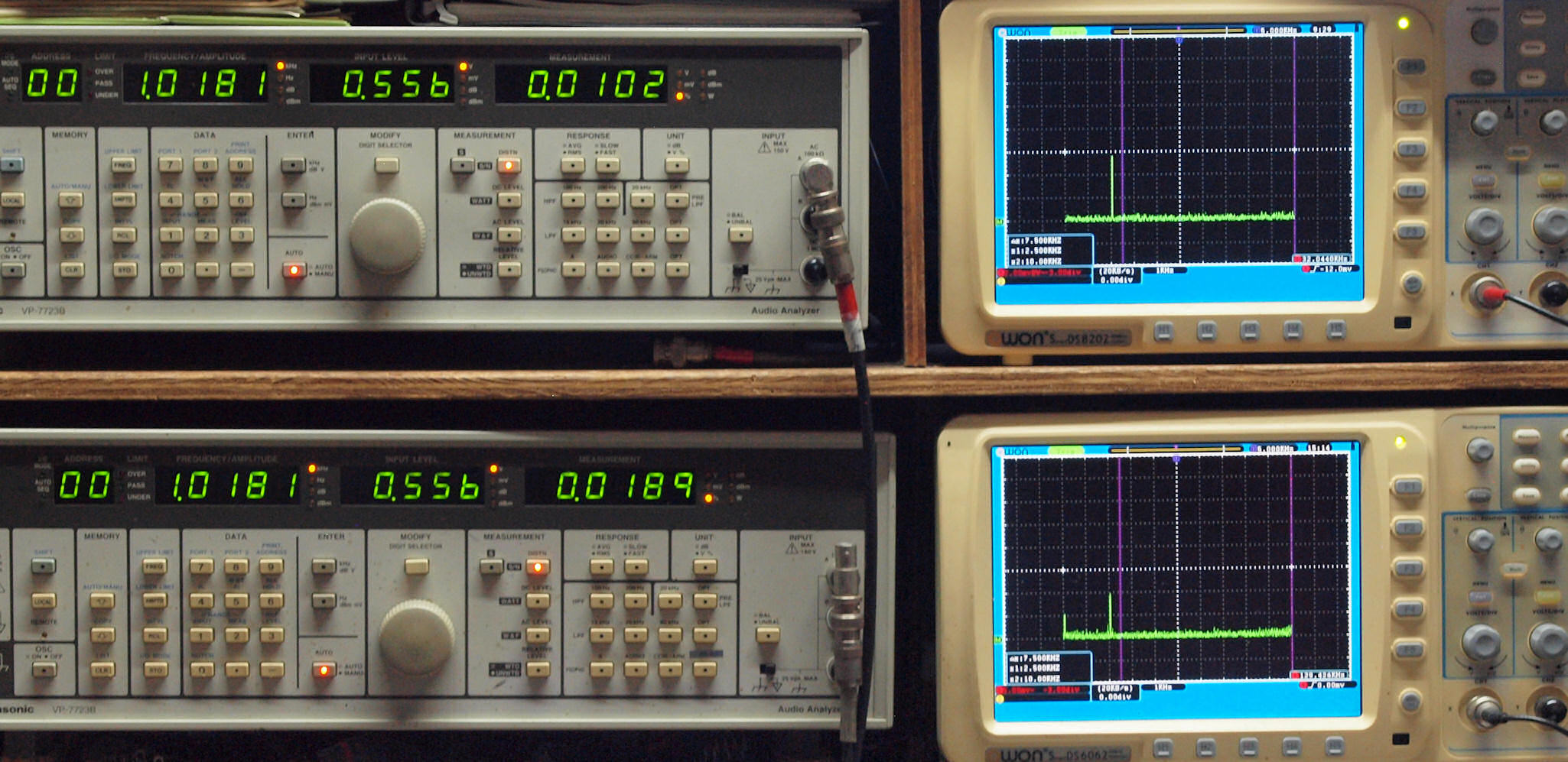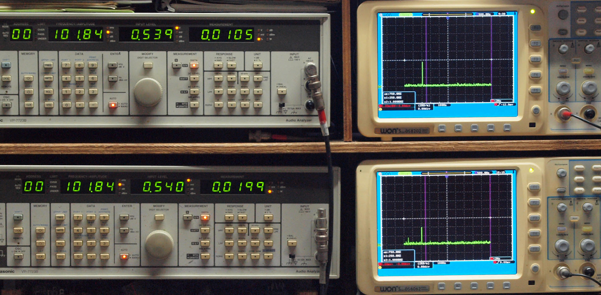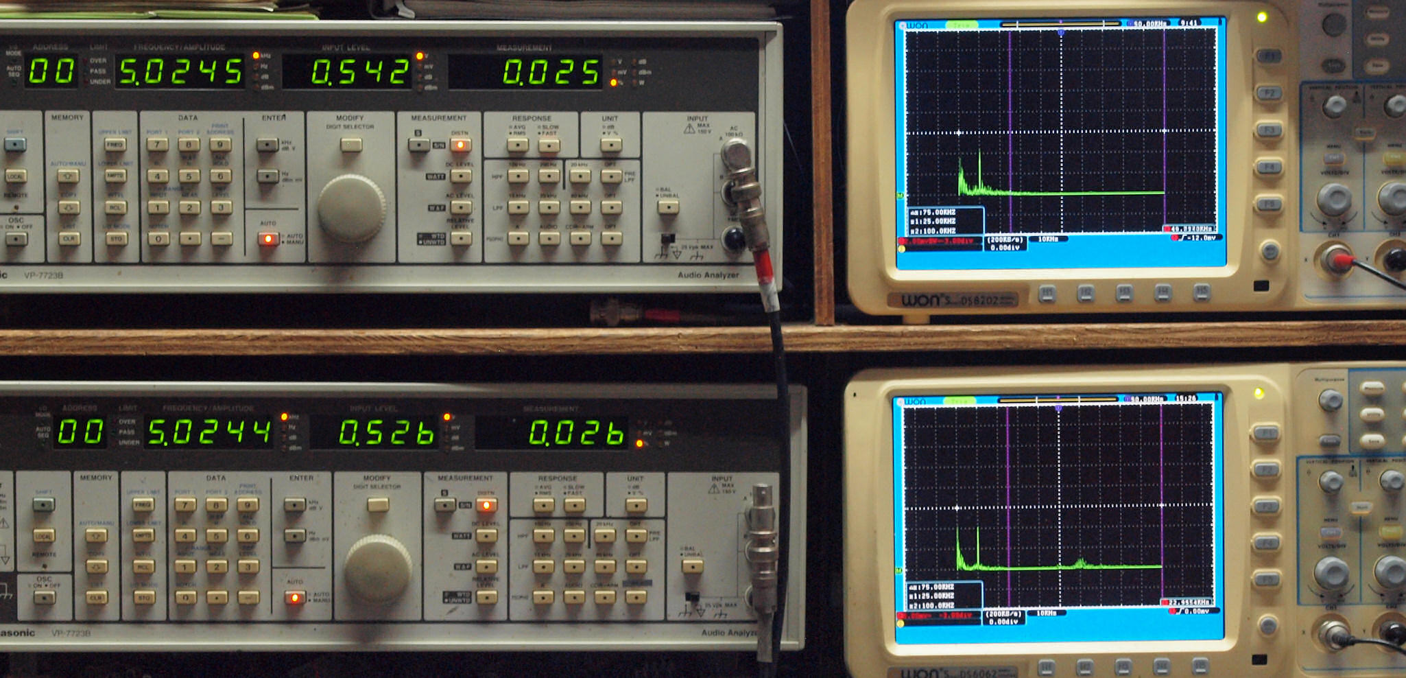 よって、ダイアル設定出力レベルより低くなります。測定機器の仕様や整備の様子はこちら、「VP−7723B」「VP−7201A」。 FFT画面の見方はこちら。