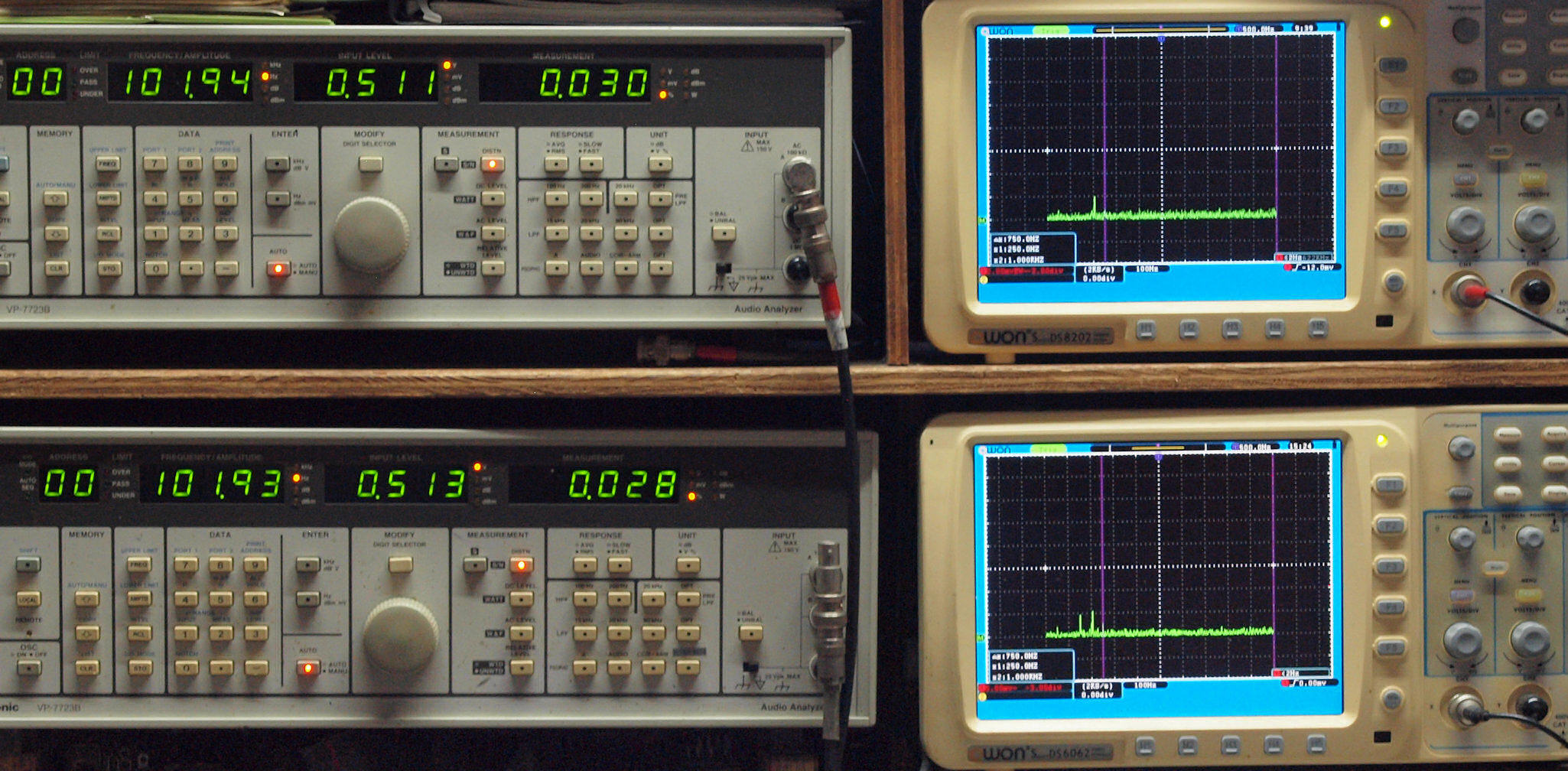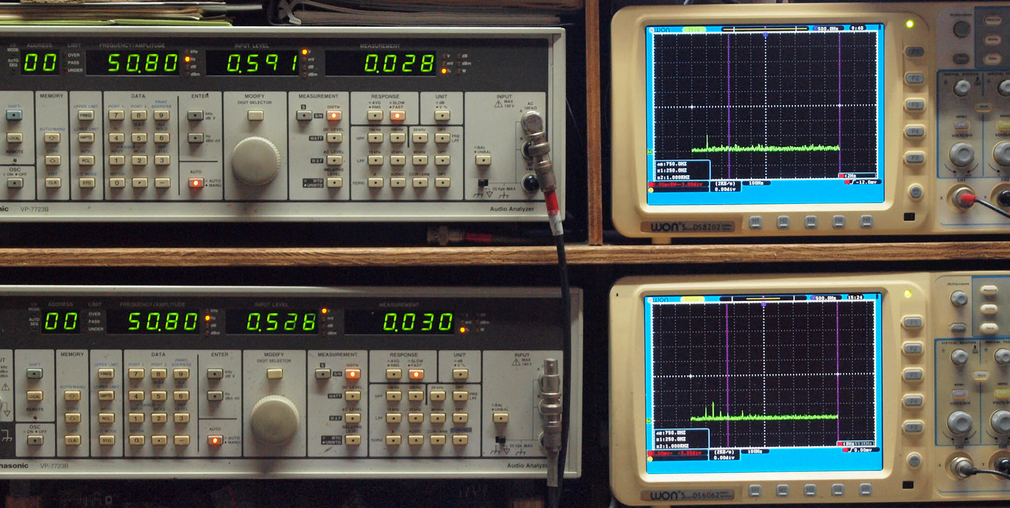 上段右端 VP−7723Bの基本波除去出力を「owon SDS8202(200MHZ)」で「FFT分析」表示。