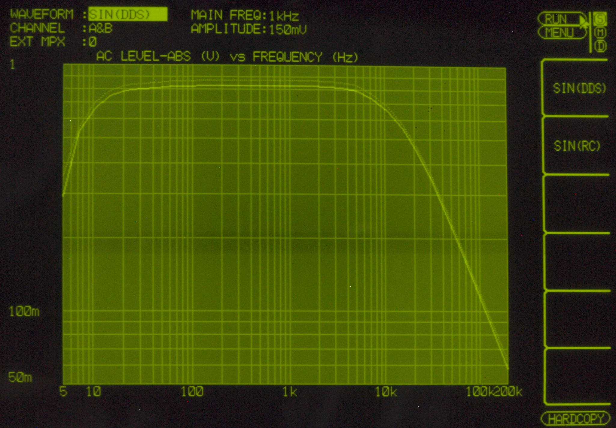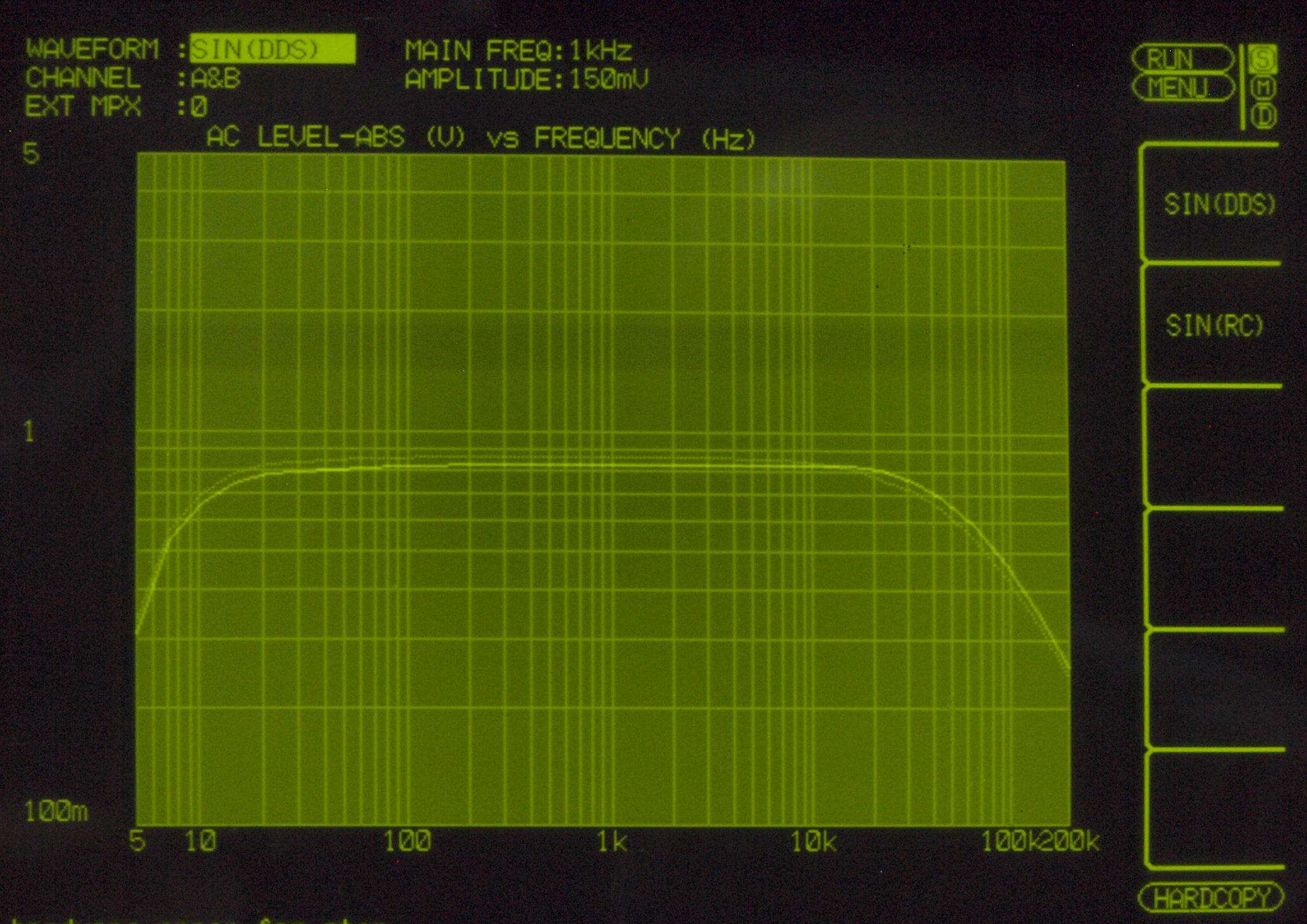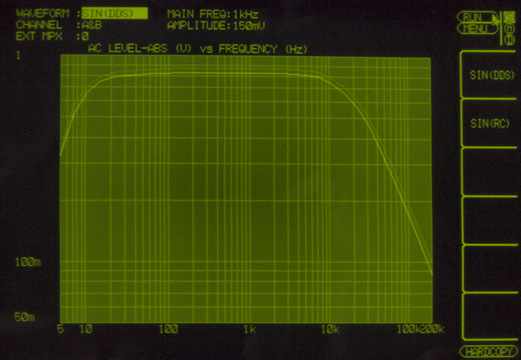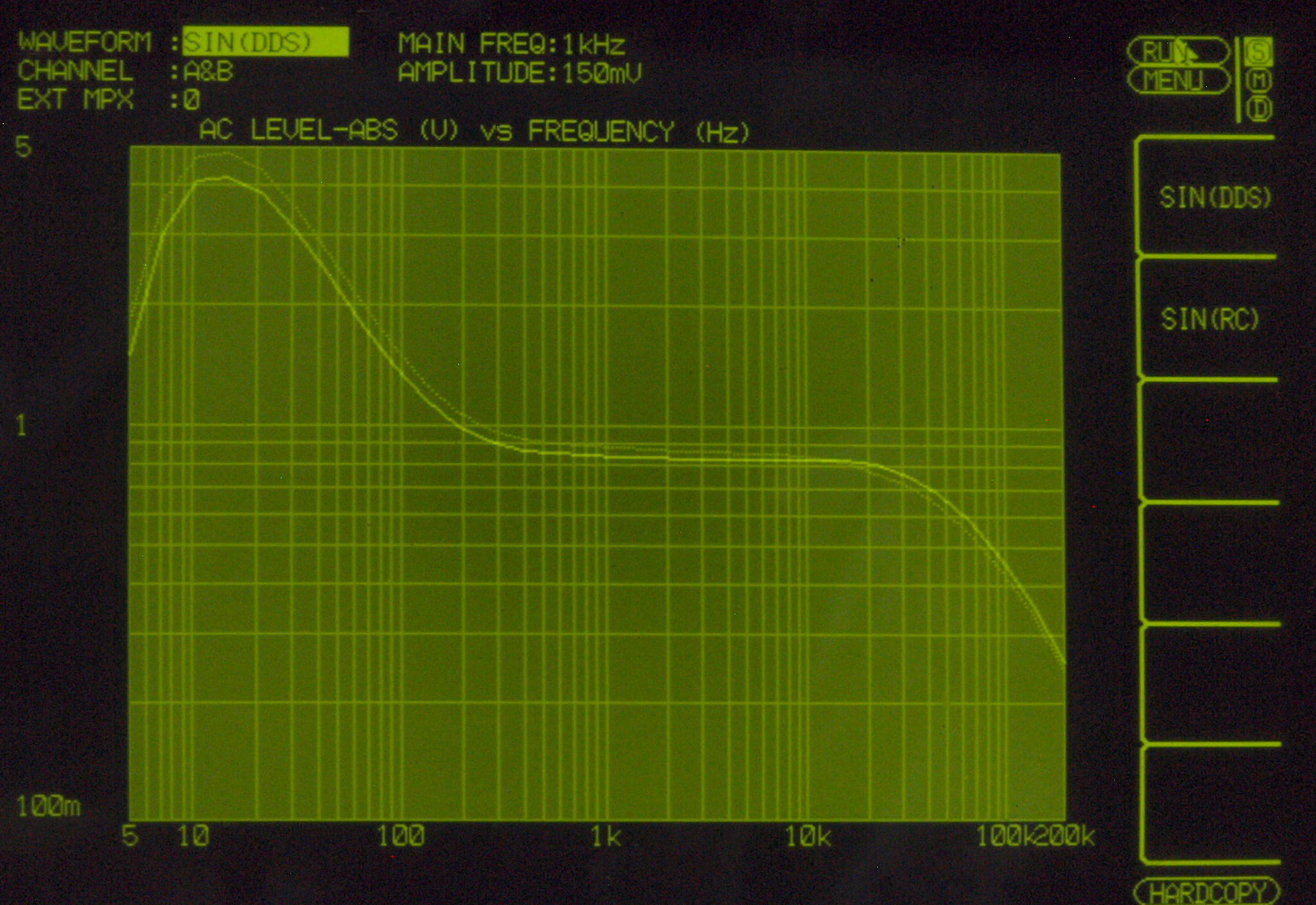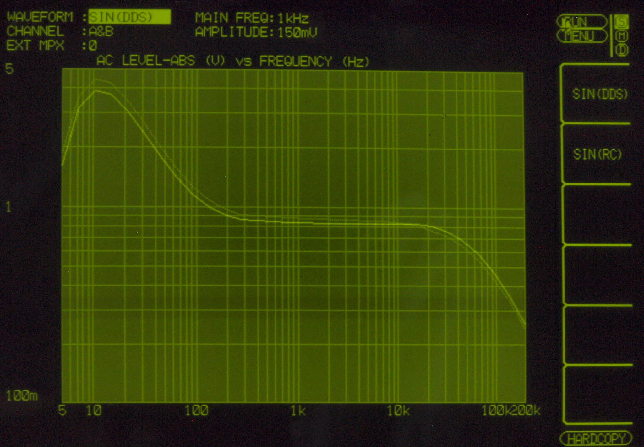 AUX入力端子へ150mV一定入力、VRはmax、左出力=薄(細い)色 右出力=濃い(太い)色。