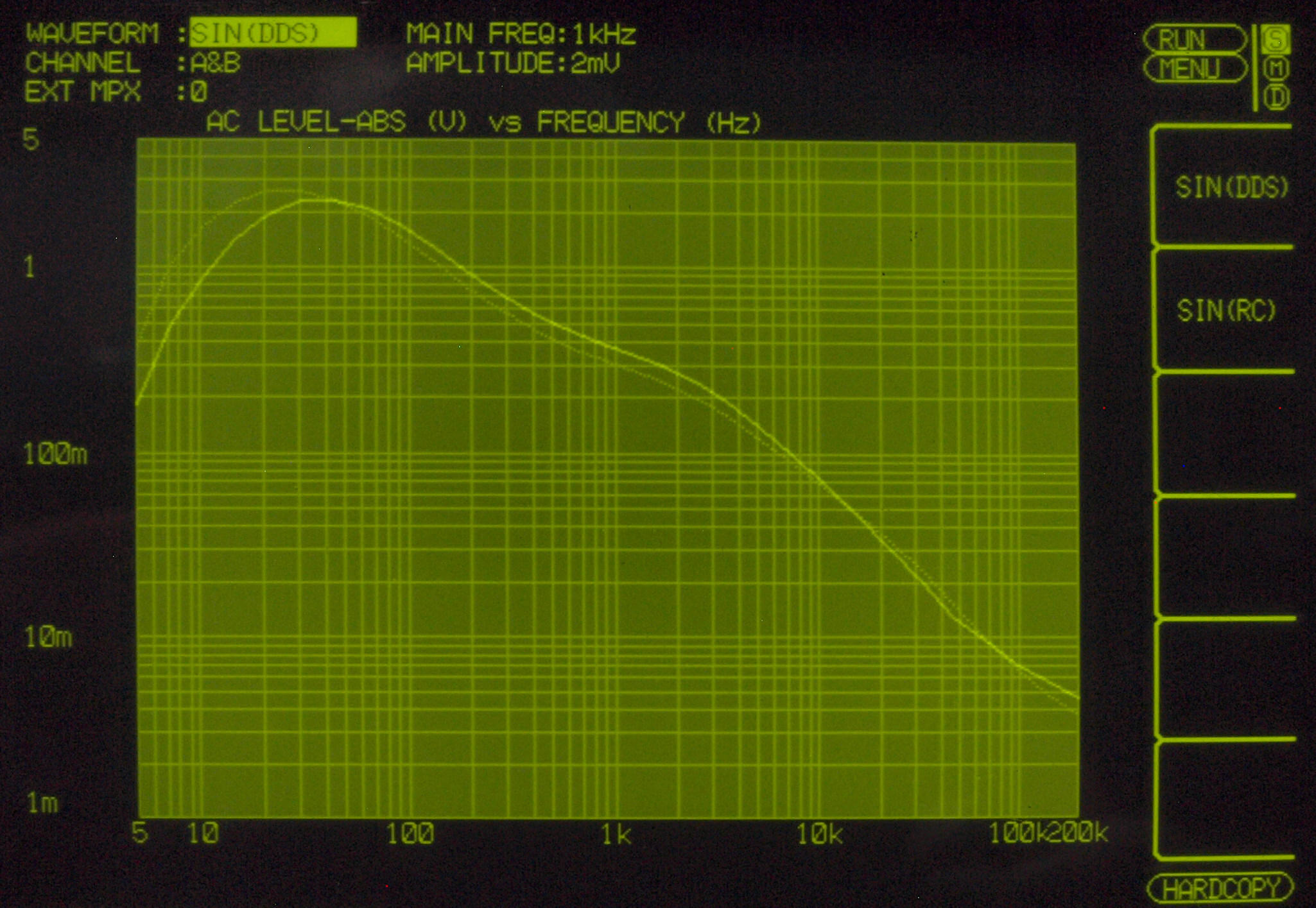 入力電圧=2mV一定入力、VRはmax、左出力=薄(細い)色 右出力=濃い(太い)色