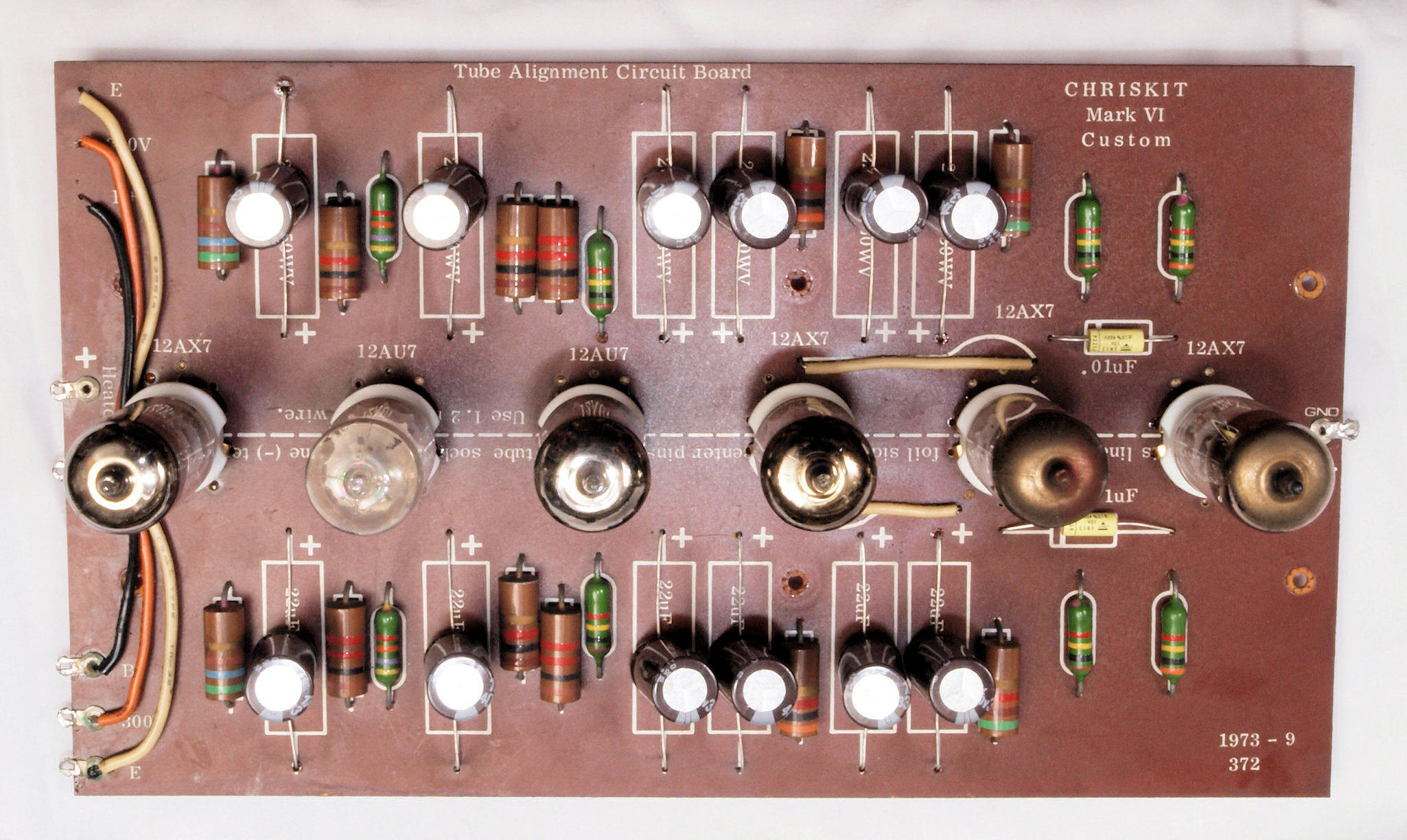 A62. 点検中 付属真空管。袴(ステム側)から見る。 5751&5814Aはヒーターが12V/175mA。12AX7&12AU7はヒーターが12V/150mA。このアンプは6本直列で72Vを供給する。
